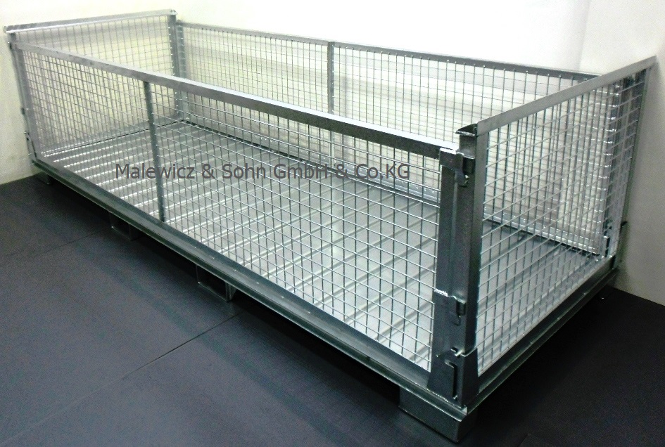 Der Boden der Gitterboxpalette ist aus Sickenblech, eine Langseite komplett herausnehmbar.