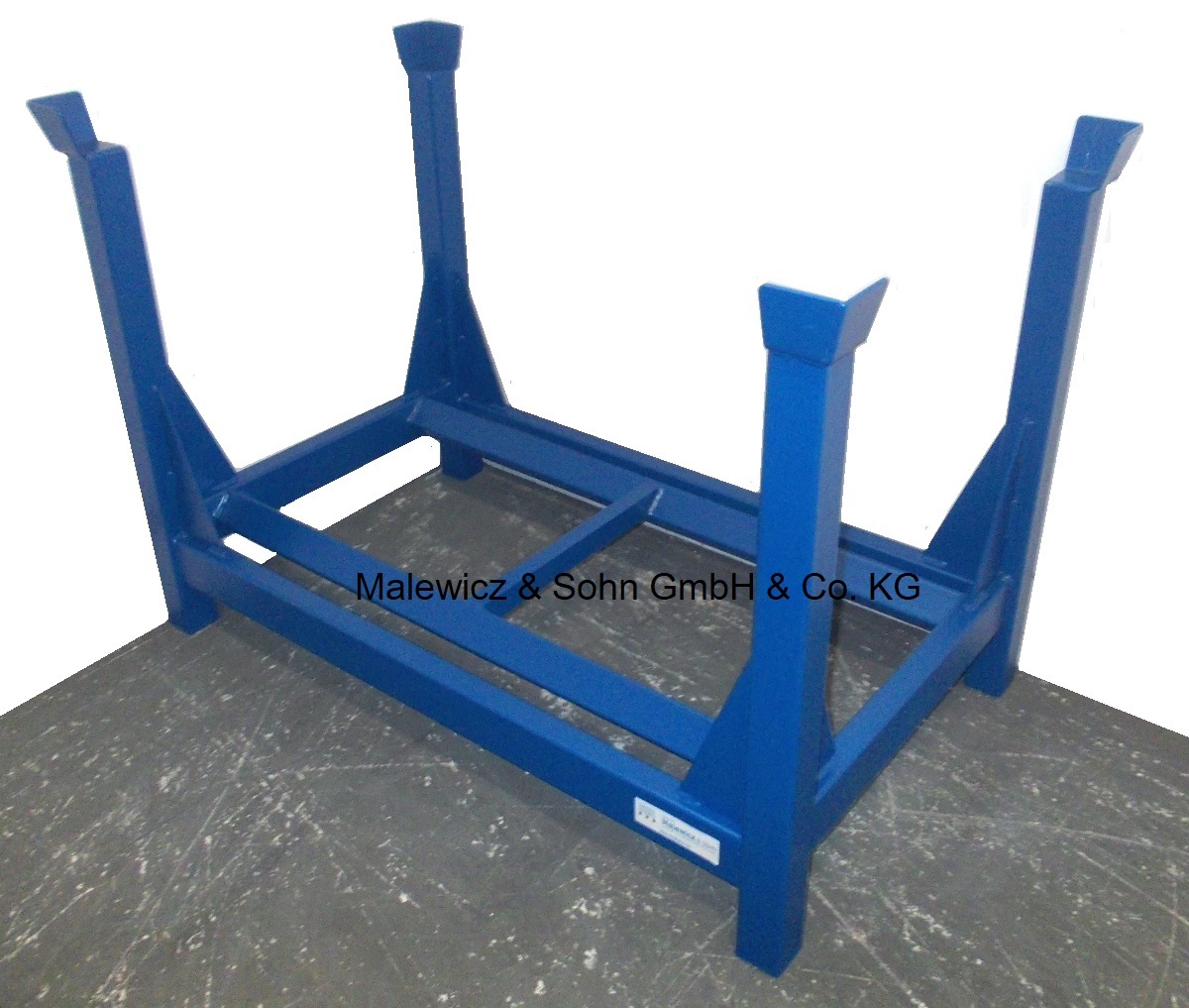 Spulentransportgestell für Drahtseilrollen, gefertigt aus stabilen Profilen. Die Schweißkonstruktion wird verstärkt durch insgesamt acht Knotenbleche, zwei Stück an jeder Seite. In der Mitte gibt es eine zusätzliche Strebe, die die Stellfläche unterteilt, damit hier zwei Drahtseilrollen aufgelegt werden können.