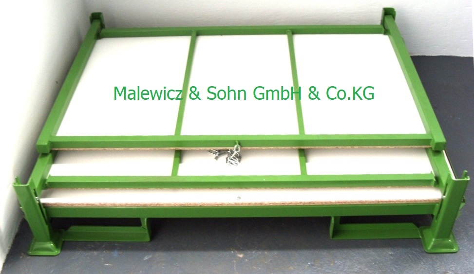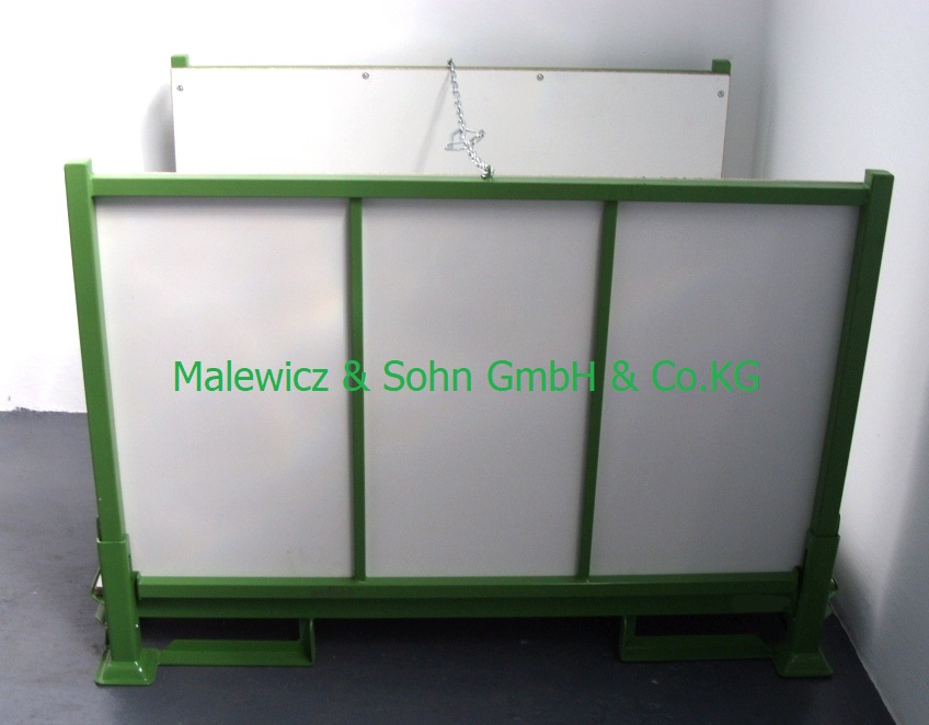 Die Konstruktion des faltbaren DTB - Behälter mit Spanplatten besteht aus Rechteckrohr, ausgekleidet am Boden und den Langseiten mit kunststoffbeschichteten Spanplatten.